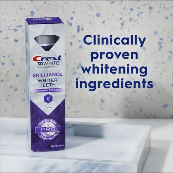 Achieve noticeably whiter teeth with Crest 3D White Brilliance, formulated with 4% hydrogen peroxide—the maximum concentration available in toothpaste. This advanced whitening formula combines clinically validated ingredients to effectively lift surface stains while maintaining enamel integrity. The triple-action whitening system works to brighten your smile and sustain results over time. Trusted by millions, Crest delivers professional-grade whitening performance in an everyday toothpaste.