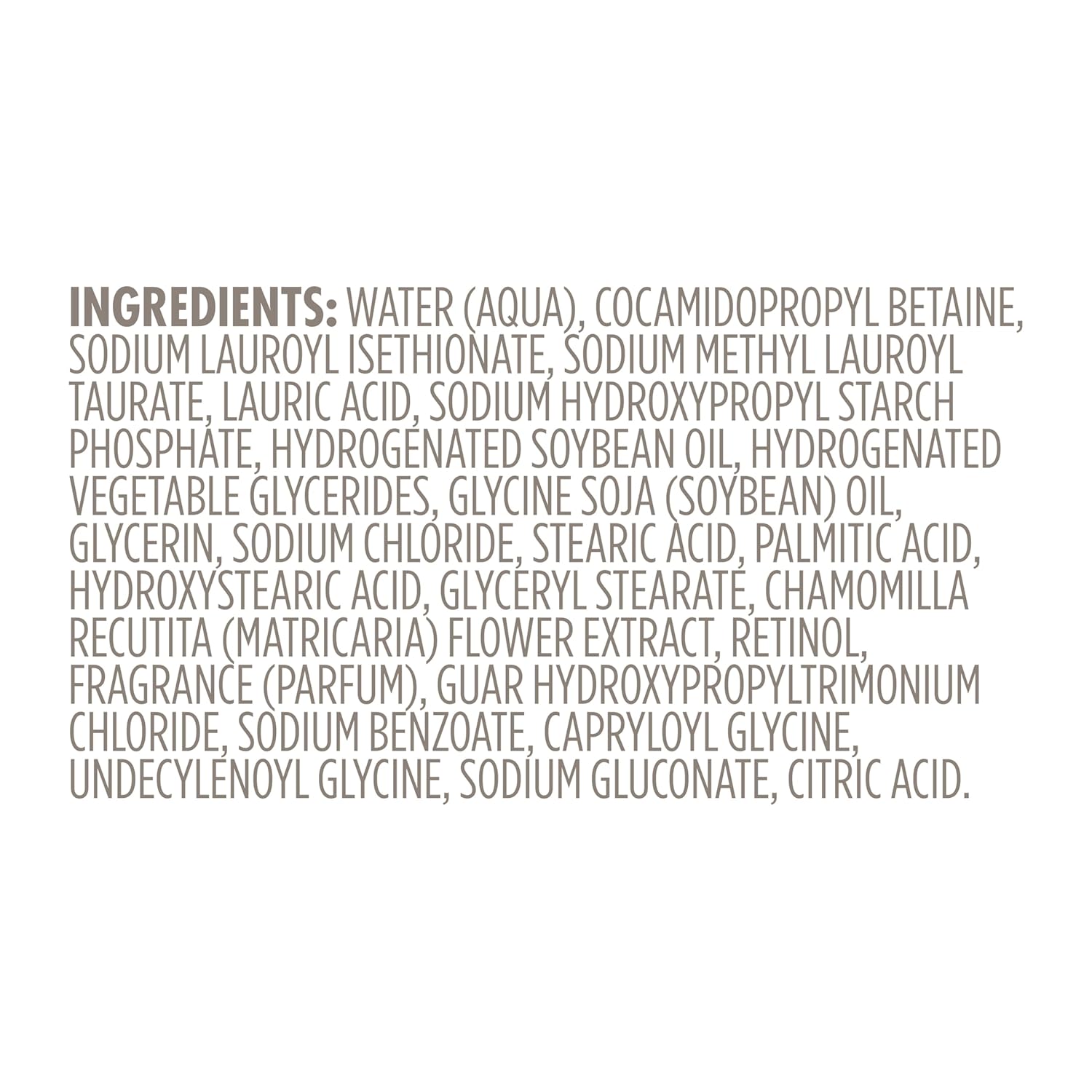 Water (Aqua), Cocamidopropyl Betaine, Sodium Lauroyl Isethionate, Sodium Methyl Lauroyl Taurate, Lauric Acid, Sodium Hydroxypropyl Starch Phosphate, Hydrogenated Soybean Oil, Hydrogenated Vegetable Glycerides, Glycine Soja (Soybean) Oil, Glycerin, Sodium Chloride, Stearic Acid, Palmitic Acid, Hydroxystearic Acid, Glyceryl Stearate, Chamomilla Recutita (Matricaria) Flower Extract, Retinol, Fragrance (Parfum), Guar Hydroxypropyltrimonium Chloride, Sodium Benzoate, Capryloyl Glycine, Undecylenoyl Glycine, Sodium Gluconate, Citric Acid.